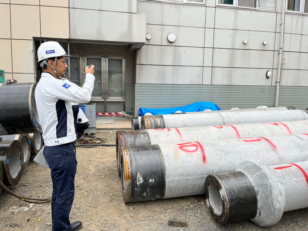 市原:はい。杭の仕様は地盤条件をもとに構造計算により設定されていますので、まずは工場で仕様通りに製作されます。今日はその杭が現場へ運び込まれ、設計内容と相違がないかを最終確認する作業になります。