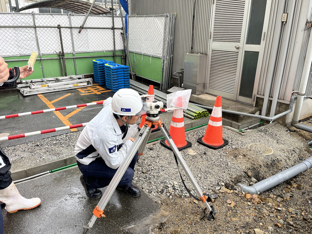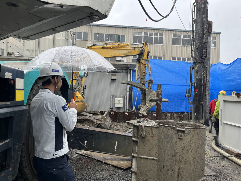市原さん(以下、市原):はい、よろしくお願いします。あいにくの天気ですが、今日は建物の基礎となる「杭打ち作業」の初日です。立会いのもと、杭が施工計画通りに打設できるかを確認します。