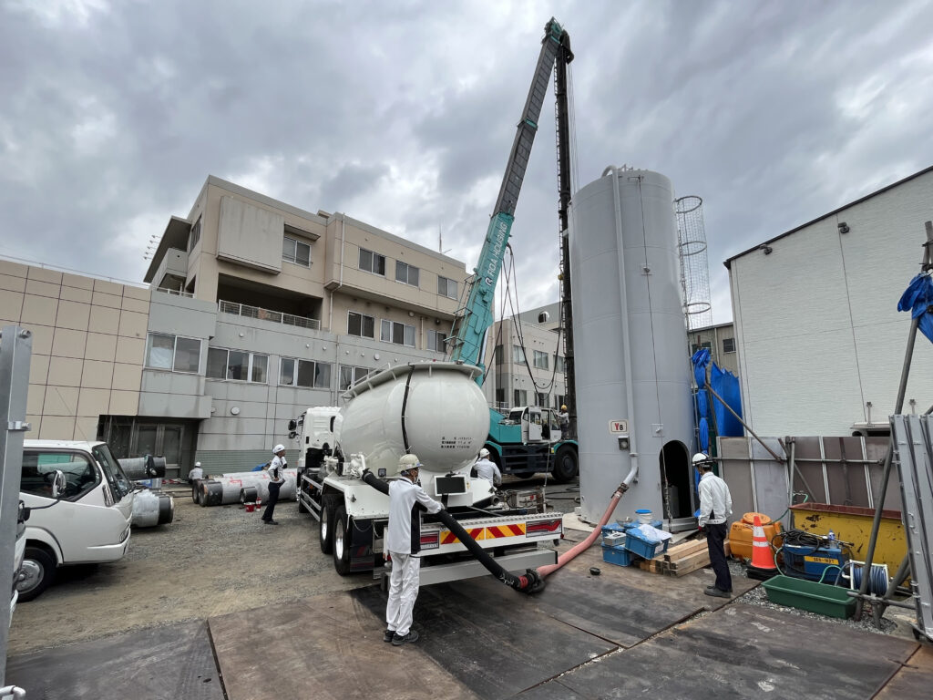 バラセメント車(中央の白い車両)からサイロ(右側のグレーの塔)にセメントを送っています
