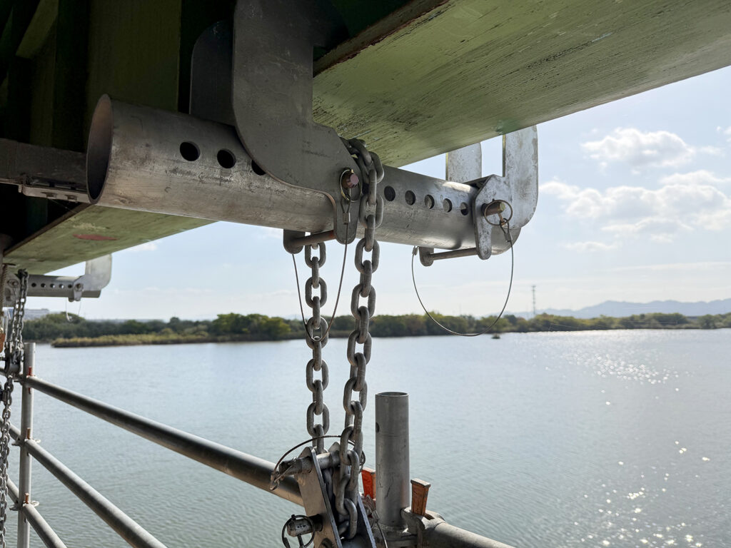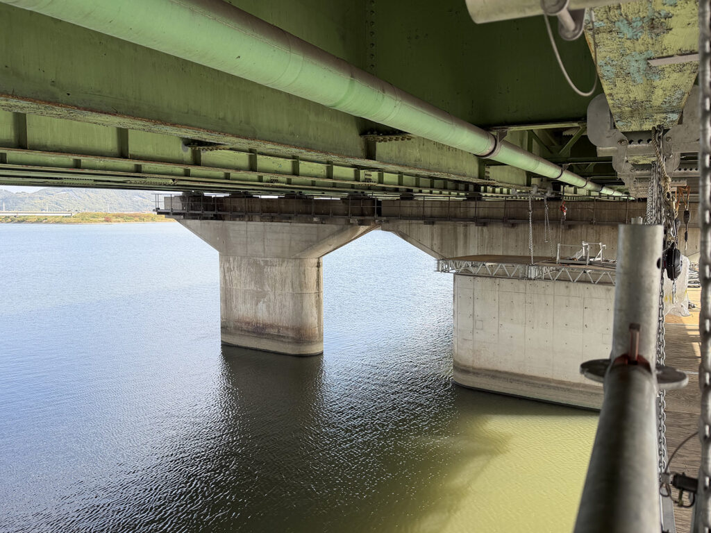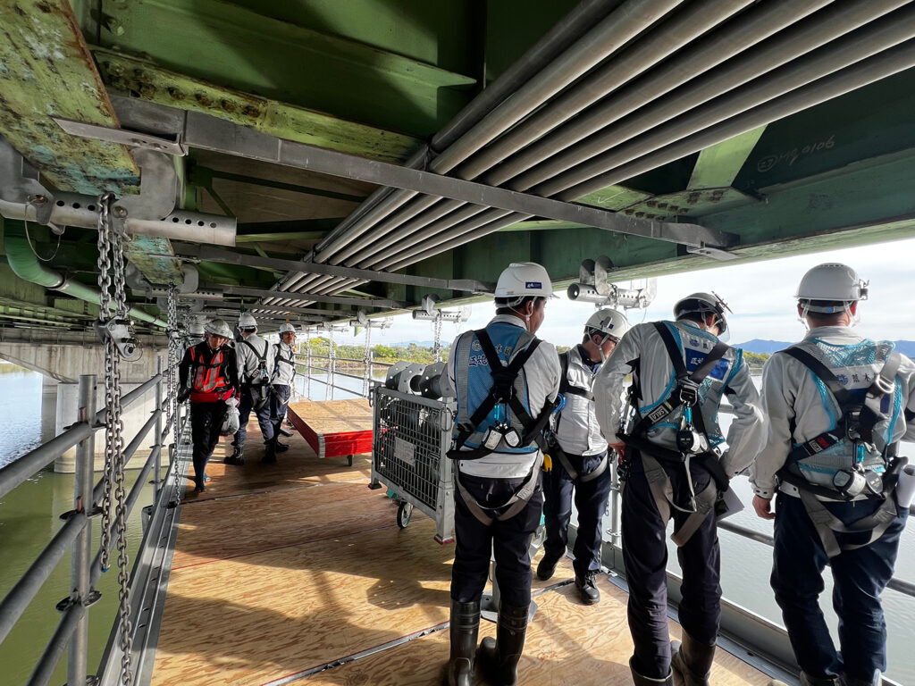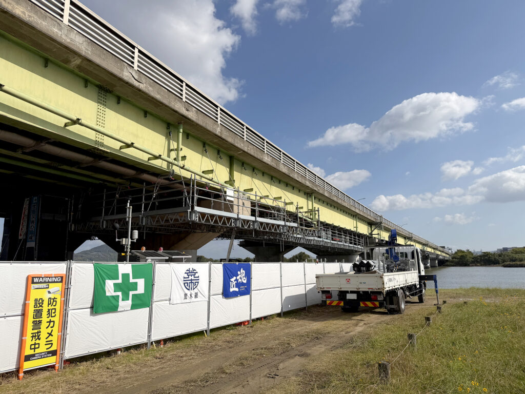 土木部が手がけている、国道2号線・百間川橋の耐震補強工事現場を追う本企画。今回は、作業用の「吊り足場」を組み立てている様子をレポートします。
